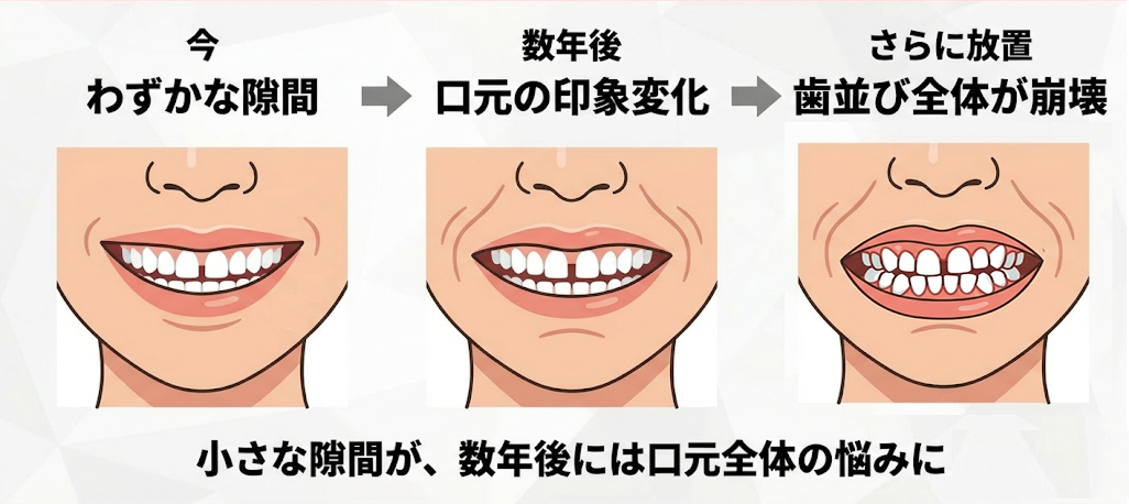 放置すると見た目の印象だけでなく、口内環境や歯並び全体に悪影響を及ぼす場合も。