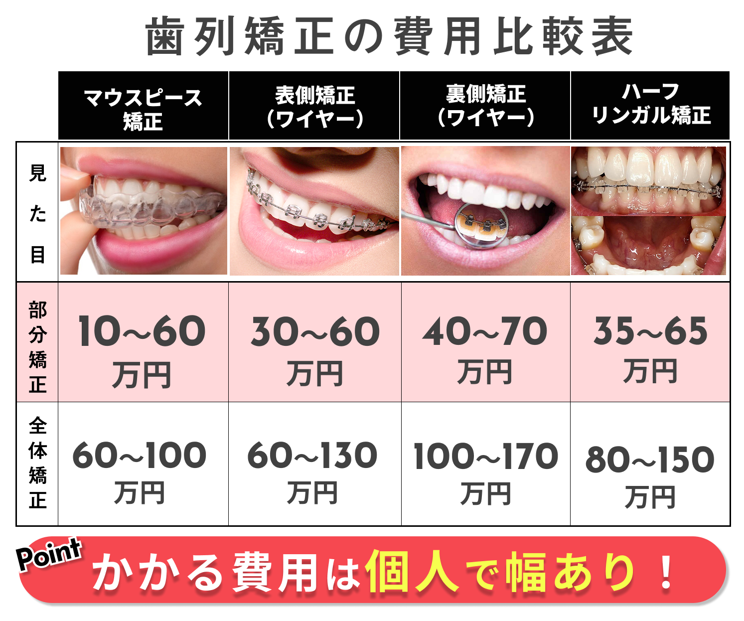 部分矯正にかかる費用は、歯科医院や矯正方法、装置の素材によって大きく変わります。